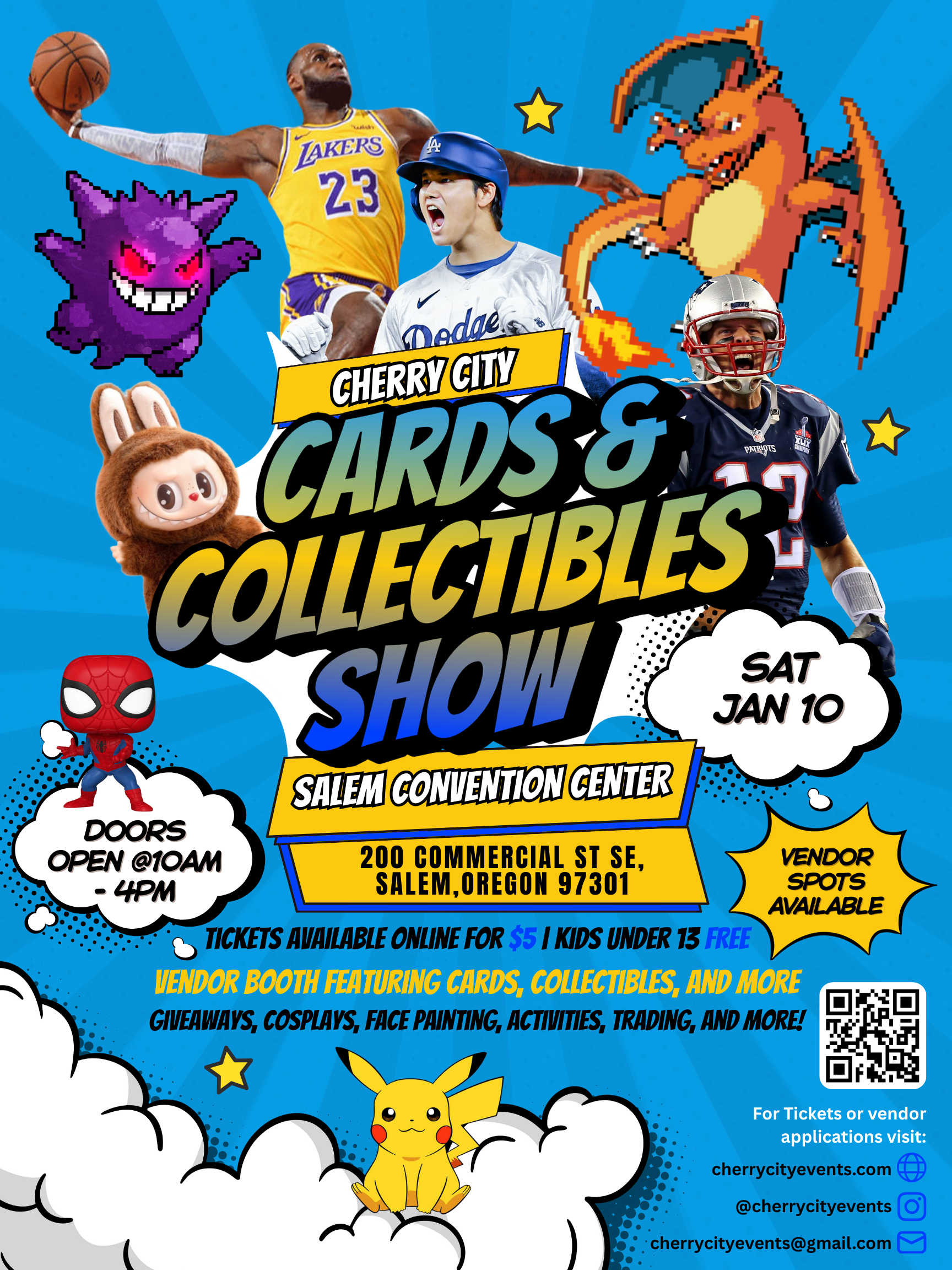 We’re excited to announce our second Cherry City Cards & Collectibles Show! Our very first show was a huge success thanks to all of you who came out to support us, and we can’t wait to do it again. This time, we’re planning even more fun, more vendors, and more giveaways to make the experience even better. We hope you’ll join us and help make our second show an even bigger success!